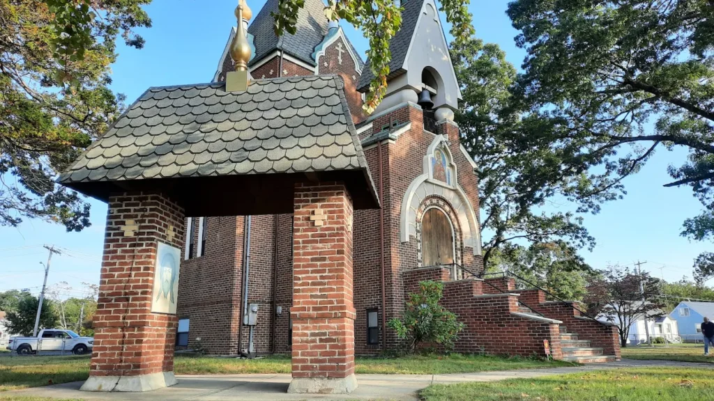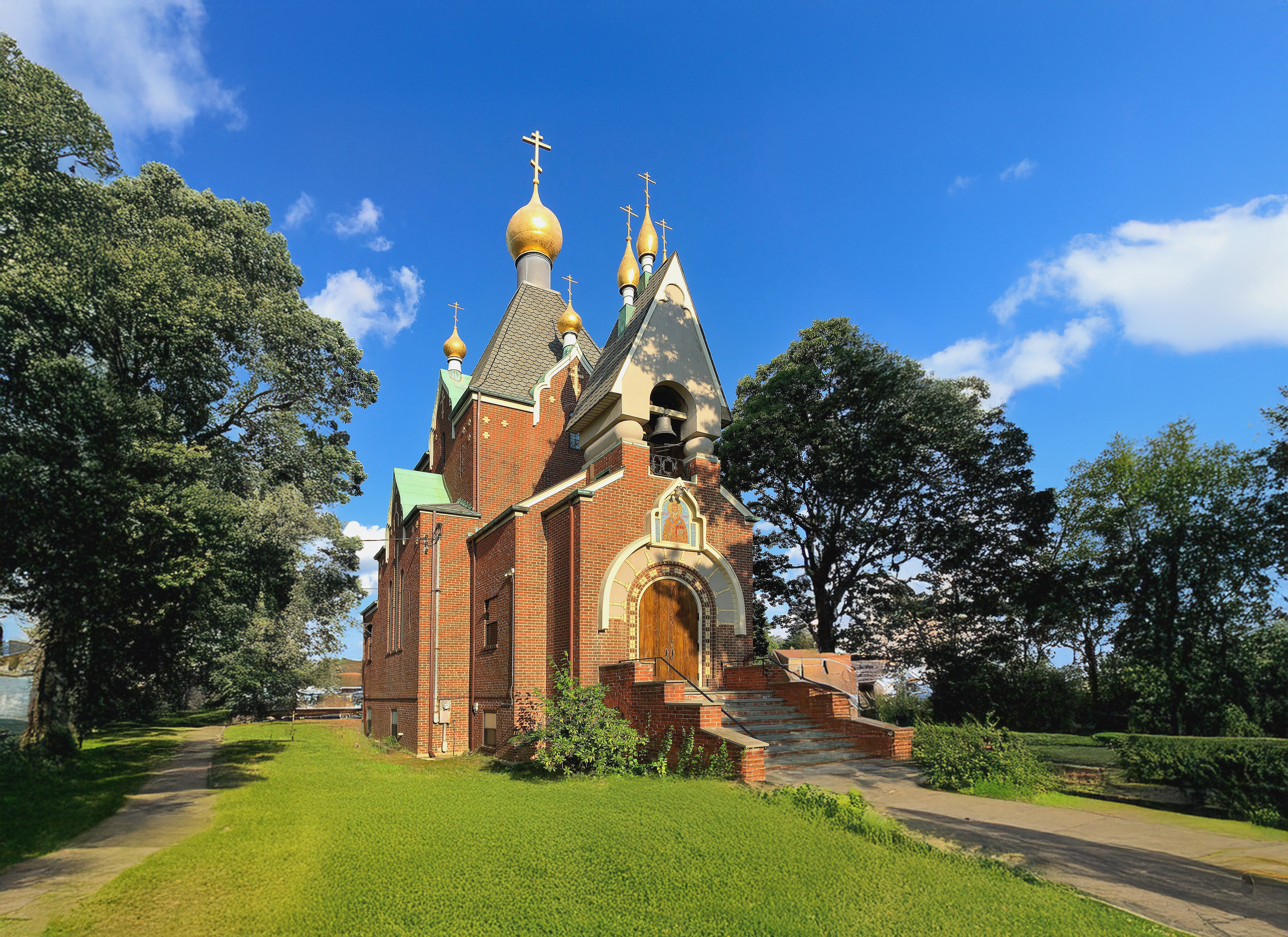 Свято-Николаевский храм в Стратфорде, хоть и небольшой, считается одним из самых живописных православных храмов восточного побережья США. Его внешний облик переносит нас к образцам русского стиля рубежа XIX–XX вв. Как отмечают исследователи, здание кубической формы, одноапсидное, без внутренних столбов, увенчано высоким шатром на стилизованной «бочке» и стройной луковичной главкой; по своей композиции оно выдержано в духе архитектуры модерна с элементами национального (неорусского) стиля. Портал оформлен полукруглой аркой-нишей, внутри которой помещён киот с мозаичным изображением святителя Николая. Особое внимание привлекает оригинальный притвор-звонница: он завершается высоким двускатным шатром с изломом (переломом скатов) и декоративными главками по углам, опирающимися на два массивных столба-кубышки. Такой выразительный силуэт явно восходит к редким образцам дореволюционного церковного модерна. В частности, практически точно такой же «островерхий» ломаный щипец-звонница с майоликовым панно ангелов можно видеть в Москве – на старообрядческом храме Воскресения Христова в Токмаковом переулке (построен в 1908 г. архитектором И. Е. Бондаренко). Совпадает и композиция в тимпане (поле фронтона над аркой): оба храма украшены пестрой поливной керамикой с церковными изображениями, что добавляет им сходства. Возможно, Роман Верховской, прекрасно знакомый с дореволюционной архитектурой Москвы, сознательно цитировал эти мотивы старообрядческого зодчества в американском проекте – тем самым перекидывая символический мост от «жемчужин» России к новому храму русской Америки.