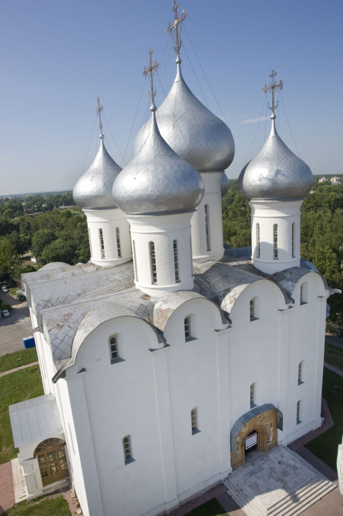 К счастью, Софийский собор в значительной степени сохранил свои формы XVI века. Его побелённые кирпичные стены расчленены лопатками и завершаются линией кровли с полукруглыми закомарами, восстановленными после Второй мировой войны. Луковичные главы, являющиеся выразительной кульминацией композиции, были перестроены в своём нынешнем виде в XVII столетии. Ажурные железные кресты над куполами были установлены в 1687 году.