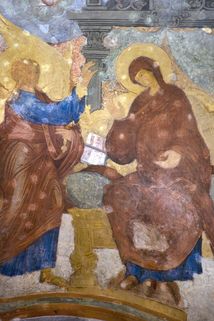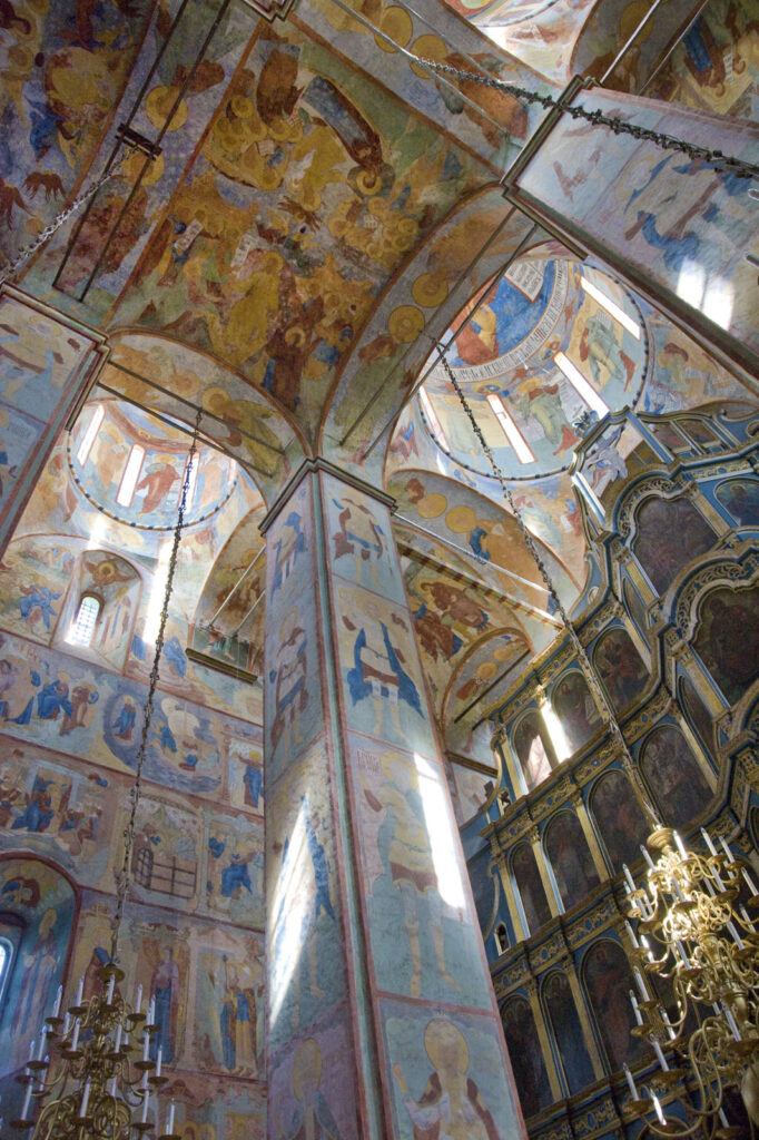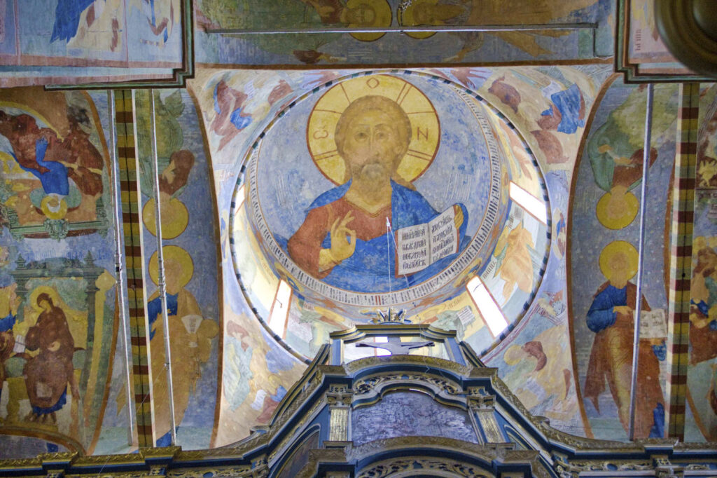 Фресковый цикл включает символы веры, основные церковные праздники, сцены из жизни Богородицы, а также эпизоды из земной жизни и притч Христа. В главной главе изображён Христос — Вседержитель, в четырёх малых главах представлены Иоанн Предтеча; Троица (Отец, Сын и Святой Дух); Богоматерь с Младенцем Христом; и Христос Эммануил. На мощных столпах, несущих своды, помещены образы мучеников и русских князей. В других зонах представлены апостолы, ветхозаветные пророки и патриархи, а также четыре евангелиста.