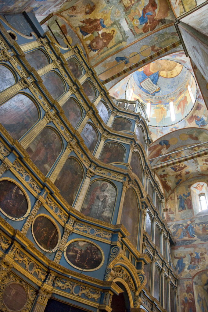 Живописное убранство Софийского собора, однако, не ограничивается фресками. Восточную часть интерьера занимает иконостас — один из крупнейших на Русском Севере, высотой более 60 метров. Каркас этого грандиозного сооружения был завершён в 1737 году Арсением Борщевским, местным монахом польского происхождения, взамен иконостаса конца XVII века, серьёзно повреждённого пожаром 1724 года. За исключением местного ряда древних икон в нижнем ярусе, новые иконы были написаны год спустя Максимом Калининым Искрицким, также выходцем из польской среды. Исполненные маслом на сосновых досках, эти произведения демонстрируют маньеристический западный стиль, предпочтительный для высшего церковного духовенства и придворных кругов России.