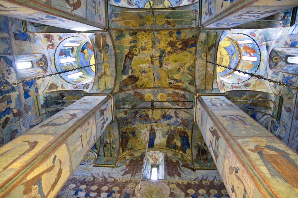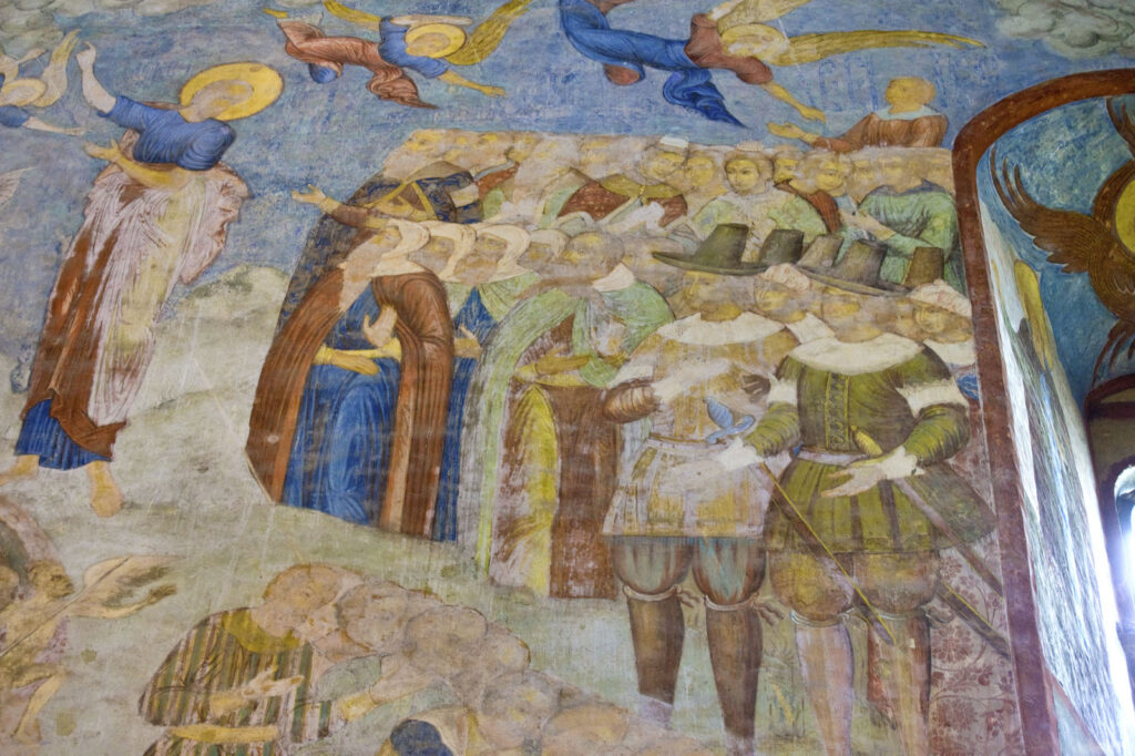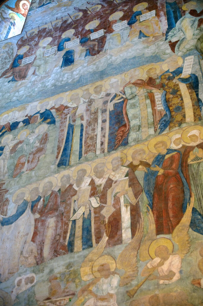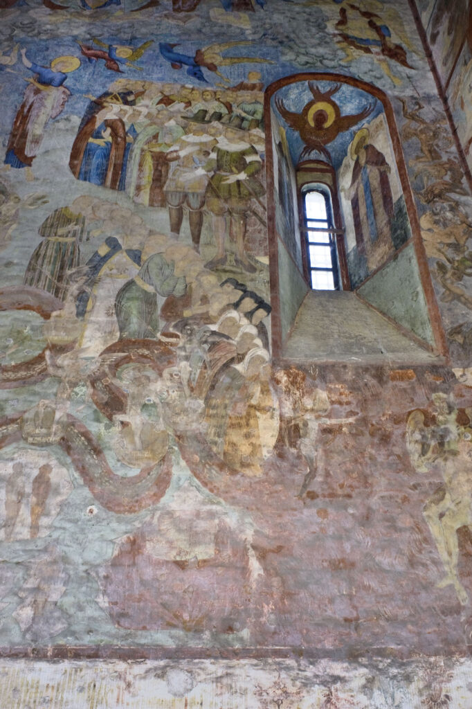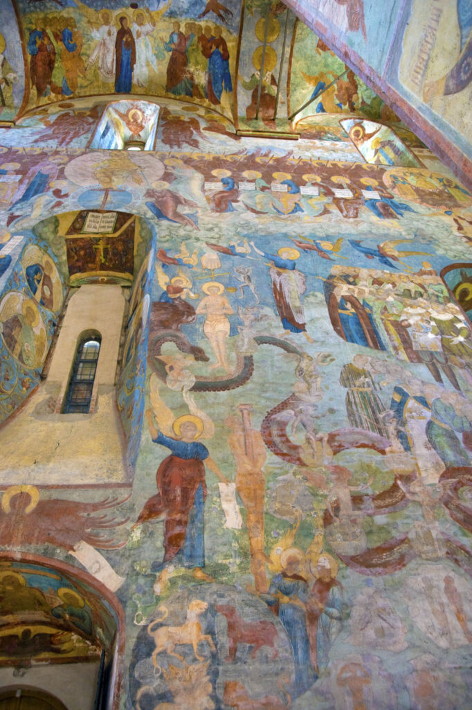 Именно фрески, однако, по праву относятся к числу шедевров русского искусства XVII века. Наиболее впечатляющее изображение расположено на западной стене, где развернута монументальная композиция «Страшный суд»: Христос восседает на престоле, тогда как Сатана изображён в аду в правом нижнем углу. В центре сцены происходит взвешивание душ; праведники, стоящие по правую руку от Христа, отделены от грешников, находящихся по левую сторону. Грешники собраны в группу, и Моисей, обращаясь к ним, указывает на православного Спасителя. Змей, опоясанный надписями с перечнем грехов, нисходит в огненную бездну ада. Этот участок росписи пострадал в результате капиллярного проникновения влаги из грунта в нижнюю часть стены.