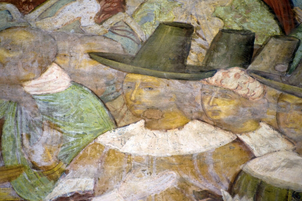 Среди осуждённых представлены элегантно одетые иностранцы — неверные, воспринимаемые как угроза православию, что отражает мировоззрение, сформировавшееся в условиях длительной изоляции России и непрекращающихся пограничных войн. Особое внимание привлекает фигура протестанта в высокой шляпе с высокой тульей, известной как капотен (в американской традиции — «шляпа пилигрима»), распространённой в северо-западной Европе XVII века.