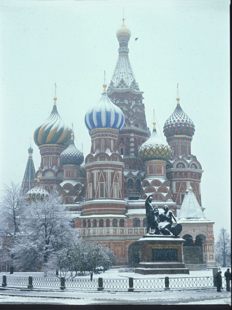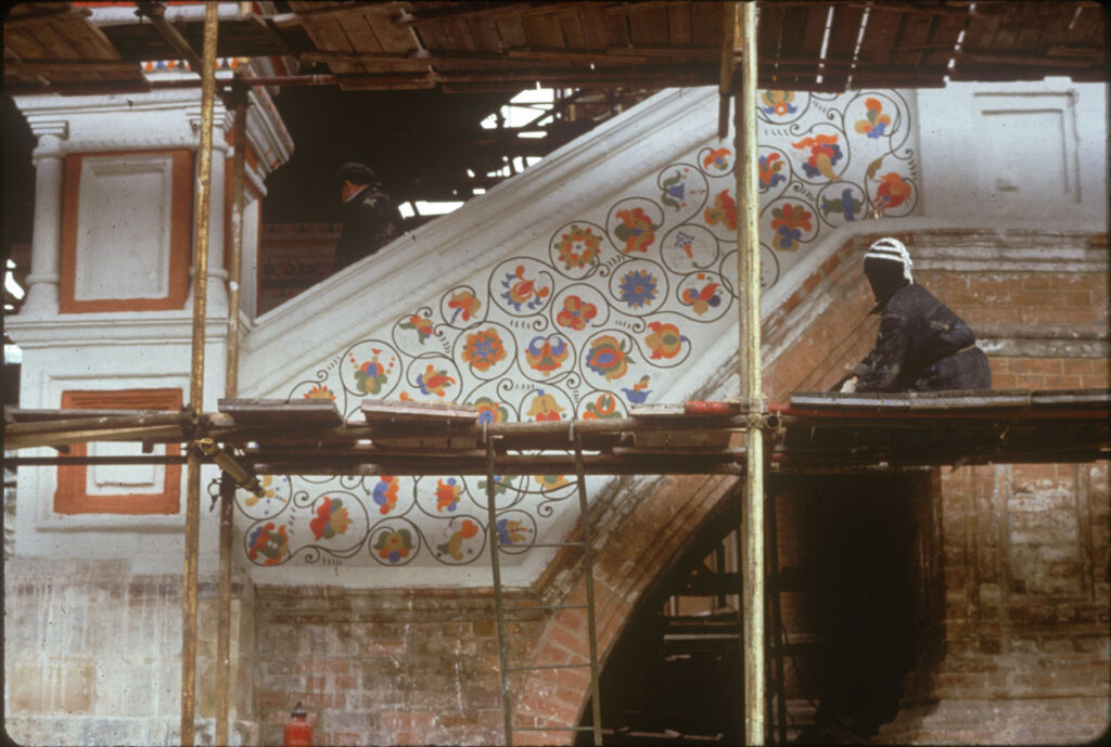 Развитие Покровского собора продолжилось в XVII веке, когда террасу вокруг ансамбля заключили в обходную галерею. Около 1680 года отдельно стоявшая колокольня у юго-восточного угла была перестроена в декоративной манере XVII века — с многоцветным убранством и шпилем из керамических изразцов. Значительная часть росписного орнамента на наружных стенах, особенно на новой галерее, также относится к позднему XVII столетию. Главы ярко раскрасили при обновлении собора в 1780-х годах. Более того, всё сооружение, включая кирпичные стены, периодически перекрашивают, чтобы освежить колорит. В исторический момент я запечатлел этот процесс осенью 1979 года, когда святыню готовили к наплыву посетителей Московской Олимпиады 1980 года.