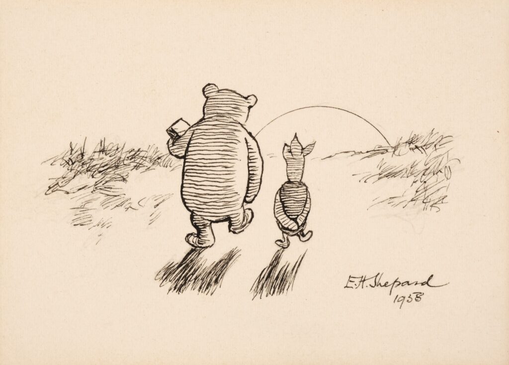 Первая книга «Winnie-the-Pooh» вышла в 1926 году, а «The House at Pooh Corner» — в 1928-м. Иллюстрации Эрнеста Шепарда стали неотъемлемой частью образа Пуха, задав визуальный канон, от которого позже будут отталкиваться все интерпретации.