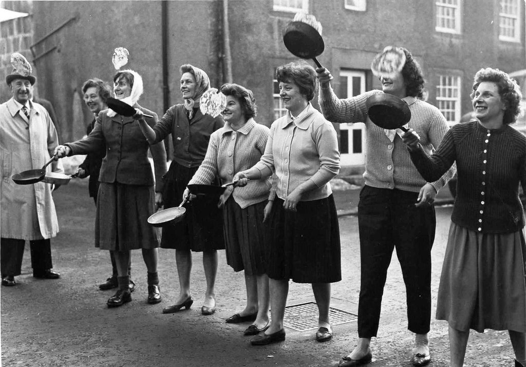 Традиция зародилась в Англии в 1445 году. По легенде, жительница английского города Олни так спешила в церковь на службу, услышав колокольный звон, что побежала туда со сковородой, на которой пеклись блины.