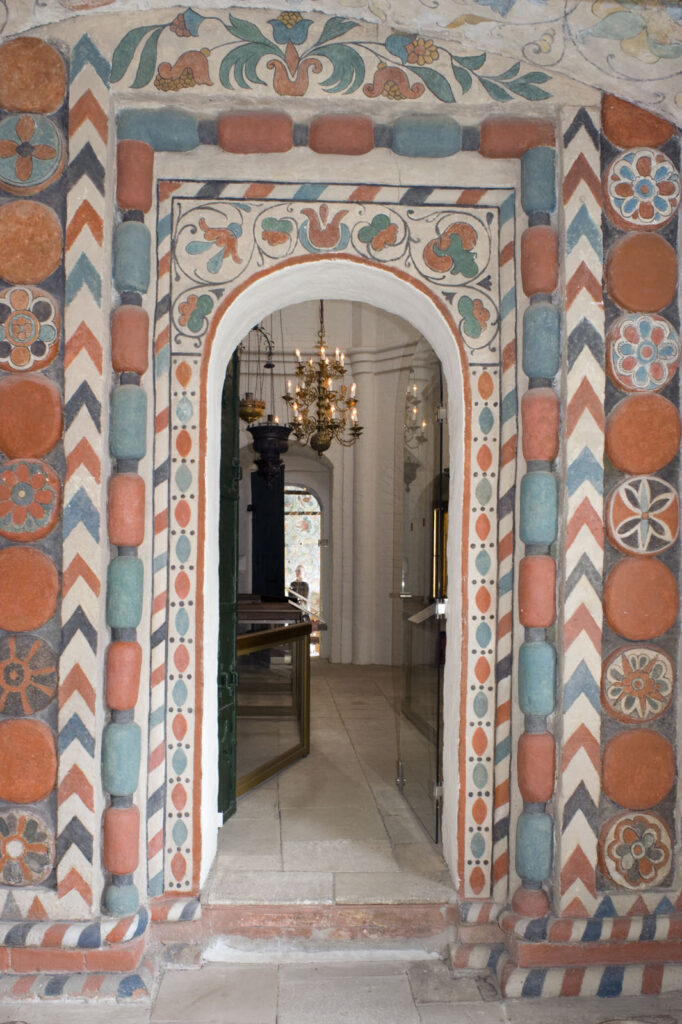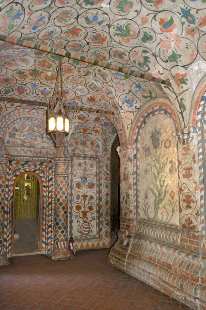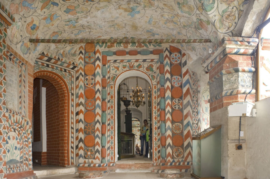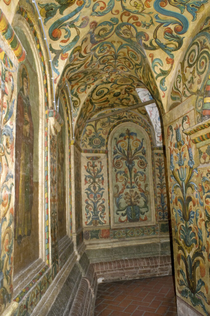 Изучение интерьера начинается с главной входной галереи, расположенной с западной стороны. К ней ведут фланкирующие лестницы под двускатными кровлями (крыльца), выходящие на возвышенную террасу, объединяющую все приделы. Первоначально открытая, терраса была обстроена стенами в ходе реконструкции ансамбля в 1680-х годах. Несмотря на стесненность пространства, галерея выглядит празднично благодаря сложным декоративным мотивам, нанесенным поэтапно в течение XVIII и начала XIX веков.