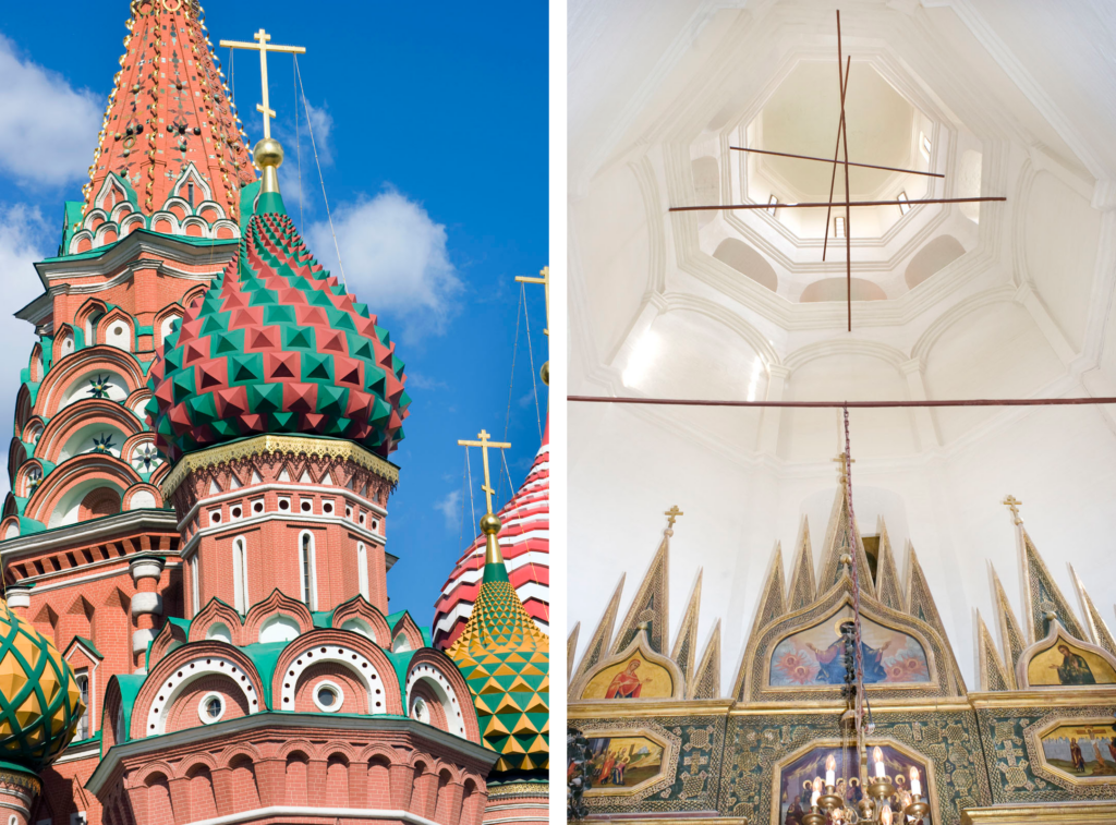 Справа: собор Покрова на Рву. Интерьер Покровской церкви, вид на восток в сторону верхнего яруса иконостаса и шатра. Фотография: Уильям Брумфилд. 2 июня 2012 г.