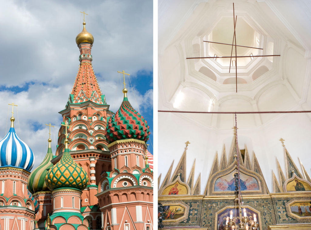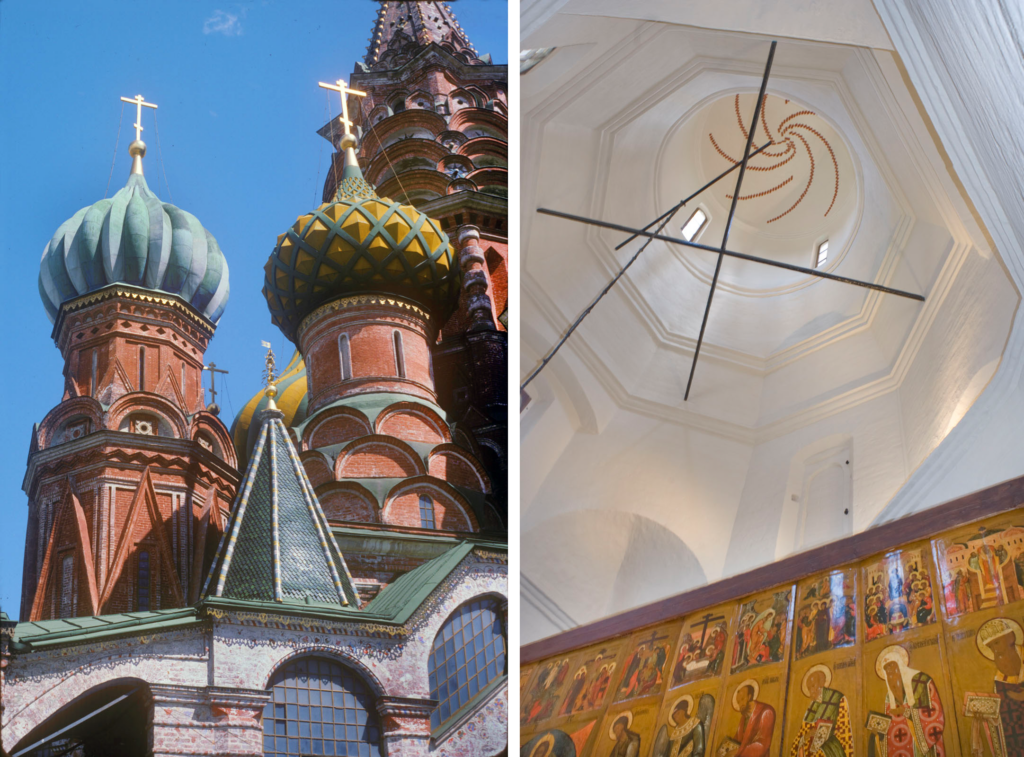 Хотя собор может показаться хаотичным нагромождением объемов, он обладает логичным планом с богатой многослойной символикой. Ансамбль Покровского собора состоит из центрального столпа (церкви Покрова), окруженного восемью отдельно стоящими церквями на едином подклете-террасе, которая в XVII веке была обстроена крытыми галереями и расписана. План ансамбля воплощает тринитарную концепцию: каждая ось, каждая диагональ и каждая сторона включают три башни, а сама структура на уровне террасы разделена на три части. На протяжении десятилетий я фотографировал этот непревзойденный памятник зодчества, а в 2012 году получил возможность запечатлеть его интерьеры с помощью цифровой техники.