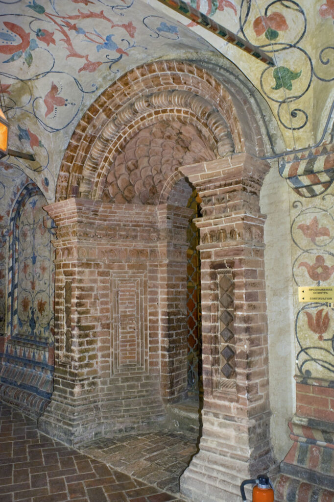 Хотя эта малая башня не расписана религиозными образами, её стены представляют собой замечательный пример техники, известной как «под кирпичи», при которой поверхности окрашивались в кирпично-красный цвет, а белые швы прочерчивались так, чтобы имитировать растворную расшивку. Этот приём, заимствованный из Италии, был применён и к кирпичным фасадам всего ансамбля в конце XVIII века. Краска не только предохраняла стены от проникновения влаги, но и усиливала цветовую выразительность поверхности.