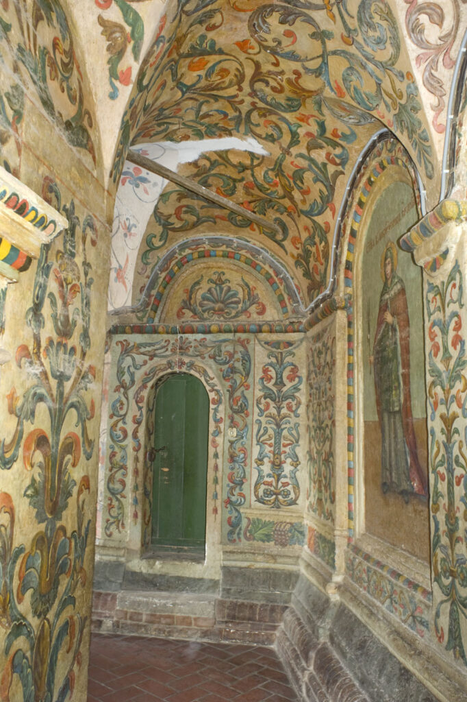Исследование интерьера начинается с главной входной галереи, расположенной с западной стороны и фланкированной лестницами, перекрытыми двускатными кровлями, которые ведут на приподнятую террасу, соединяющую составные церкви ансамбля. Первоначально открытая, терраса была закрыта в ходе перестройки комплекса в 1680-х годах. Несмотря на крайне стеснённые размеры, галерея производит праздничное впечатление благодаря сложным декоративным мотивам, наносившимся этапами в течение XVIII и начала XIX века.