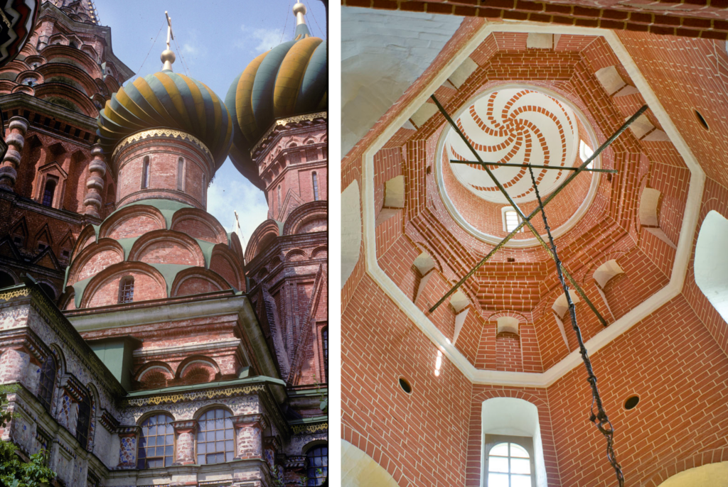 Происхождение собора Василия Блаженного, или Покровского собора, столь же сложно, как и его форма. Вскоре после взятия Казани 1–2 октября 1552 года Иван повелел возвести на площади за Кремлём, у Фроловских ворот, церковь во имя Святой Троицы. Он намеревался перестроить этот храм в масштабе, соответствовавшем значению победы над Казанью, которая не только устранила беспокойный реликт монгольской власти, но и открыла огромные пространства для колонизации и торговли. Хотя храм может показаться хаотическим нагромождением объёмов, его зодчие — обычно называемые Бармой и Постником Яковлевым — создали логически выстроенный замысел, насыщенный множественными смысловыми слоями.