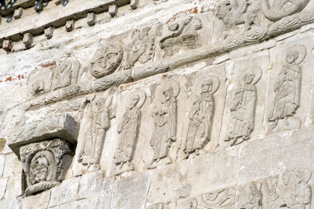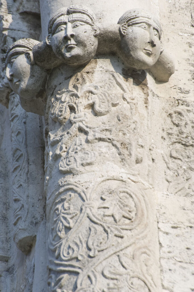 Георгиевский собор. Западный фасад с резным белокаменным фризом святых, капителью с женским маскароном и полосой с львиным маскароном и химерой. Фотография: Уильям Брумфилд. 21 августа 2013 года.