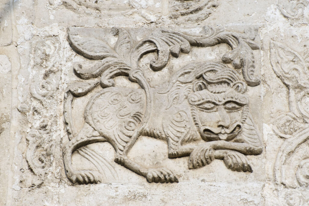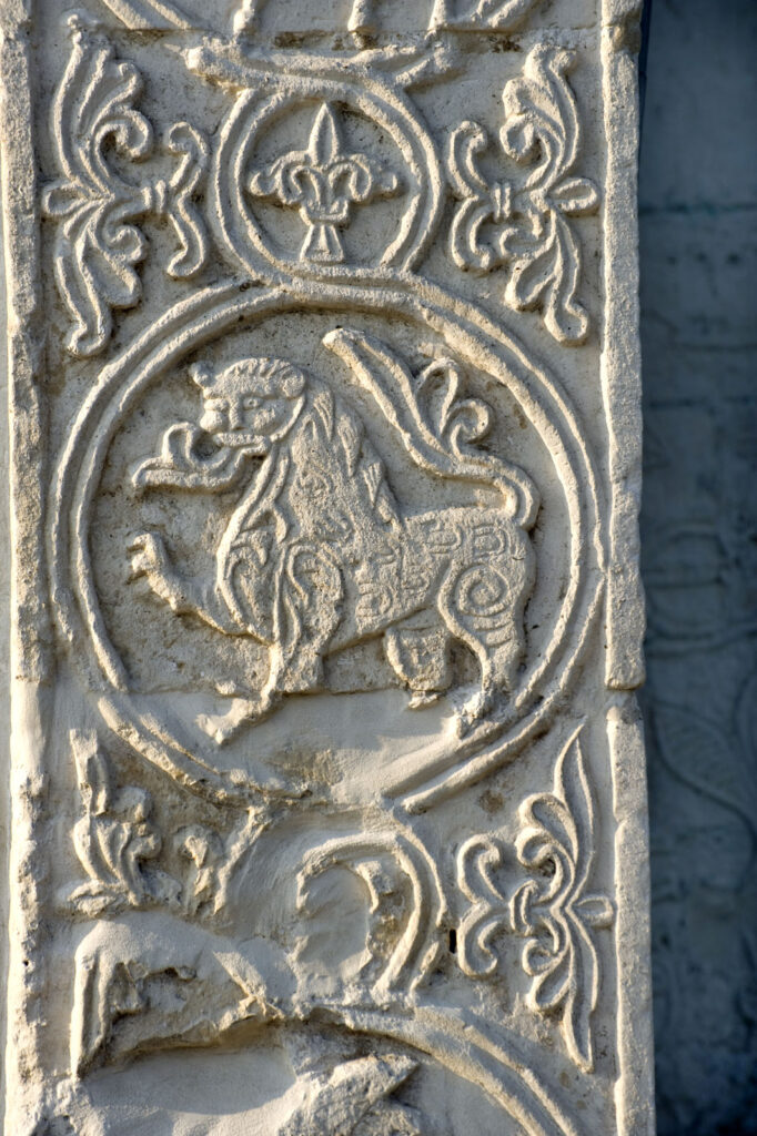 Георгиевский собор. Южный притвор, юго-восточный угол, резная белокаменная полоса с геральдическим львом в плетёном орнаменте. Фотография: Уильям Брумфилд. 21 августа 2013 года.