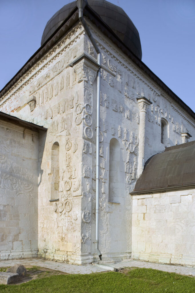 Кроме того, поверхность стен была покрыта низкорельефным растительным узором, высеченным уже после того, как блоки были установлены на место. Плотный орнамент покрывал нижнюю часть здания, включая приставные колонны, так что архитектурные детали, столь ясно выявленные в Дмитриевском соборе во Владимире, здесь как бы растворялись в монолитном резном массиве.