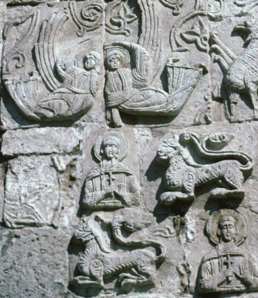 Георгиевский собор. Южный фасад с рельефной резьбой святых, геральдических львов и гарпий. Фотография: Уильям Брумфилд. 9 августа 1994 года.