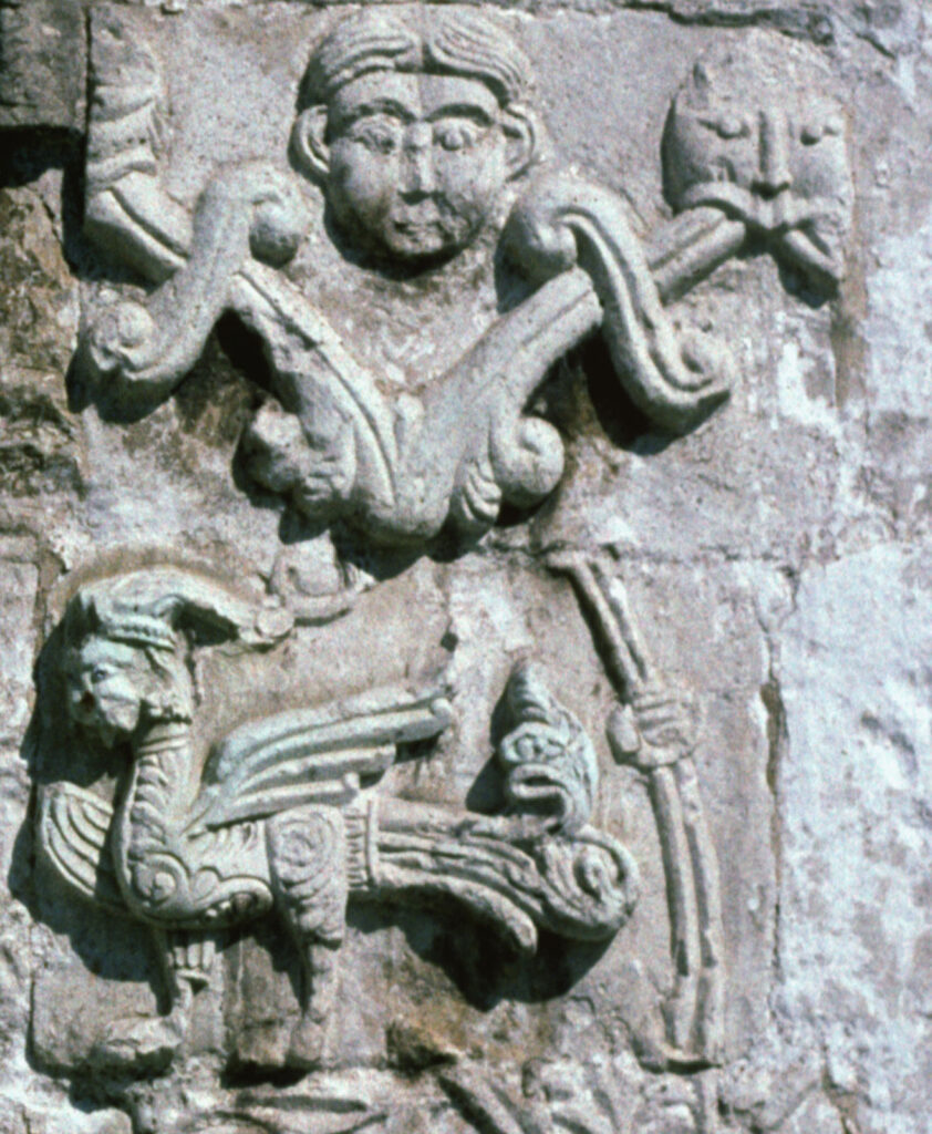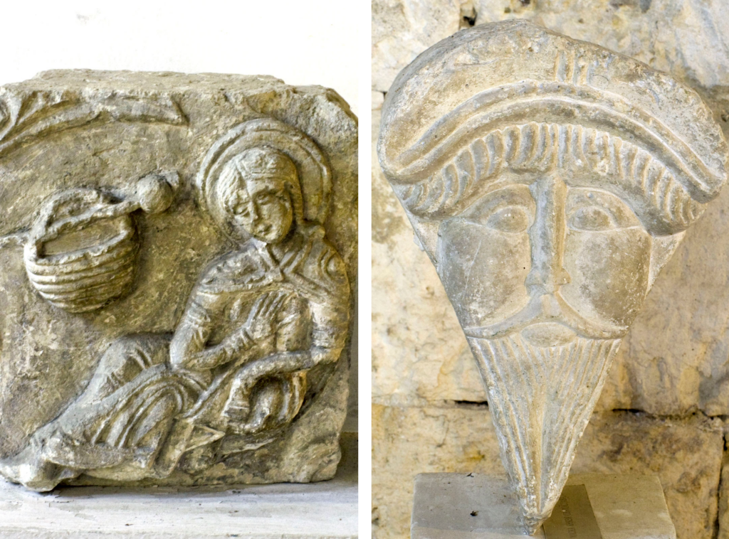 Справа: Георгиевский собор. Резной белокаменный блок с изображением спящей девы. Фотография: Уильям Брумфилд. 22 августа 2013 года. Слева: Георгиевский собор. Резной белокаменный маскарон. Фотография: Уильям Брумфилд. 22 августа 2013 года.