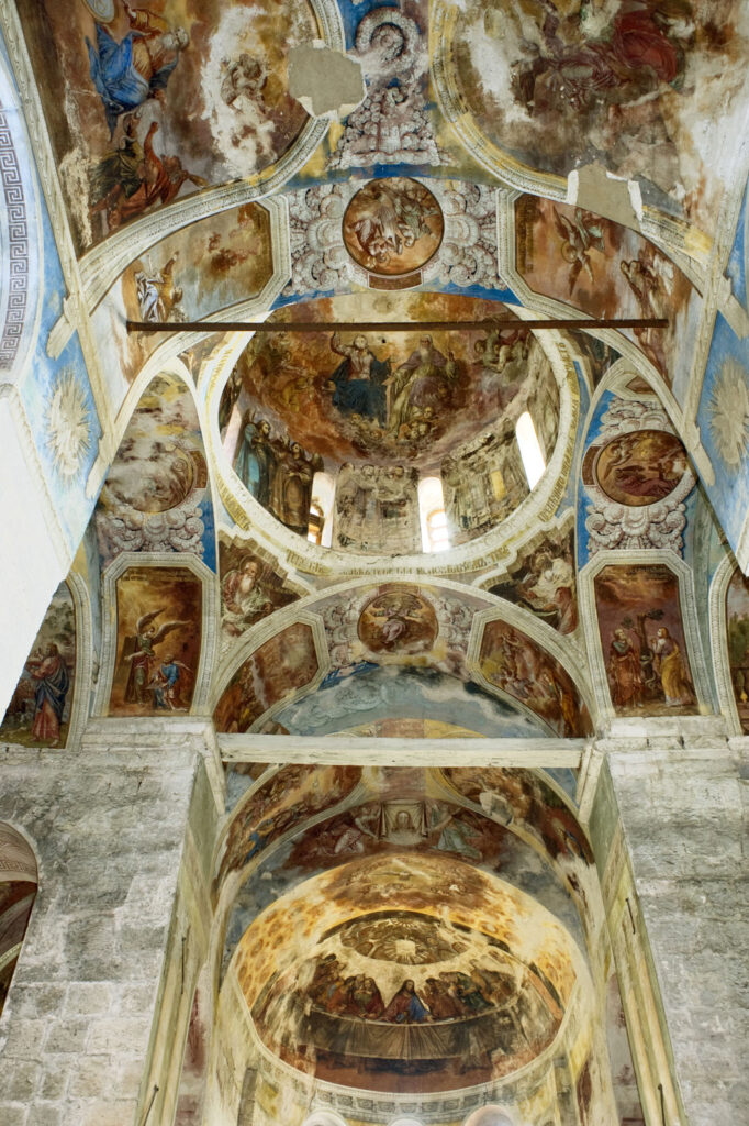 Георгиевский собор. Интерьер, вид на восток в сторону апсиды с настенной росписью XIX века «Тайная вечеря». Роспись купола: изображение Святой Троицы. Фотография: Уильям Брумфилд. 22 августа 2013 года.