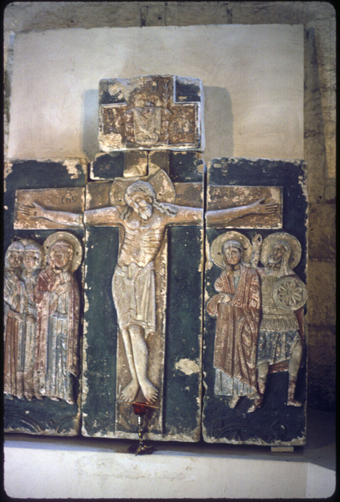 Георгиевский собор. Расписные резные белокаменные панели XIII века с изображением Распятия. Фотография: Уильям Брумфилд. 30 июня 1995 года.