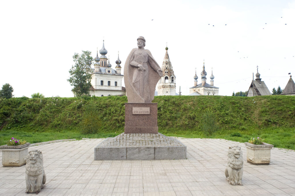 Юрьев-Польский. Памятник Юрию Долгорукому (2002; скульптор Игорь Черноглазов). На заднем плане, монастырь Архангела Михаила. Слева направо, собор Архангела Михаила, колокольня, тёплая церковь Святого Иоанна Богослова, деревянная церковь Святого Георгия. Фотография: Уильям Брумфилд. 22 августа 2013 года.