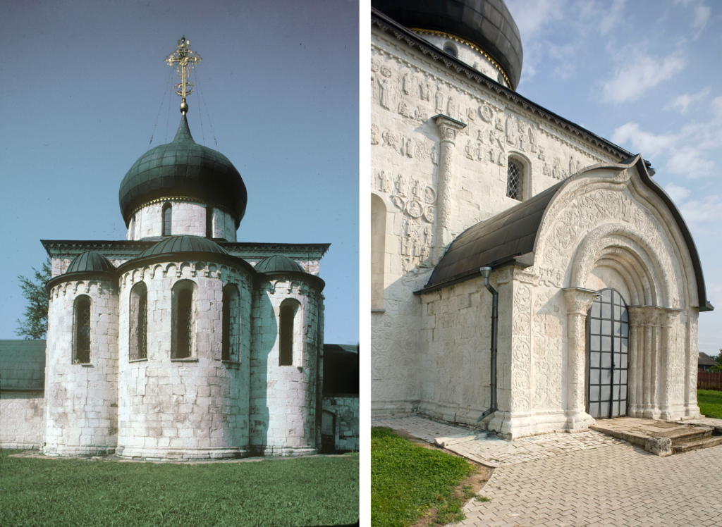 Слева: Георгиевский собор. Вид с востока, с апсидой. Фотография: Уильям Брумфилд. 9 августа 1994 года. Справа: Георгиевский собор. Южный фасад с южным притвором, белокаменной резьбой и перспективным порталом. Фотография: Уильям Брумфилд. 22 августа 2013 года.